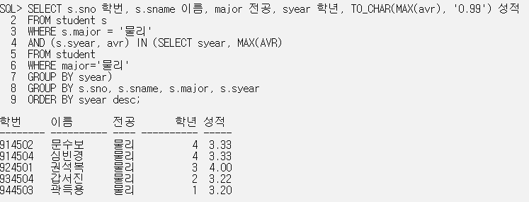 SELECT s.sno 학번, s.sname 이름, major 전공, syear 학년, TO_CHAR(MAX(avr), '0.99') 성적