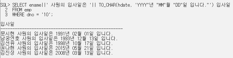 SELECT ename||' 사원의 입사일은 '|| TO_CHAR(hdate, 'YYYY"년 "MM"월 "DD"일 입니다."') 입사일