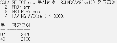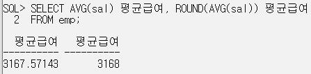 SELECT AVG(sal) 평균급여, ROUND(AVG(sal)) 평균급여 // ROUND외에 to_char도 사용 가능