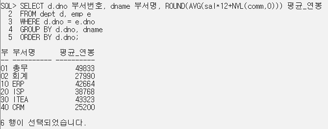 SELECT d.dno 부서번호, dname 부서명, ROUND(AVG(sal*12+NVL(comm,0))) 평균_연봉