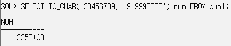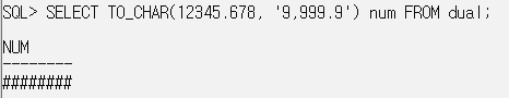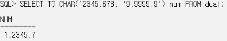SELECT TO_CHAR(12345.678, '9,9999.9') num FROM dual; // 소수점 이하가 부족하면 반올림