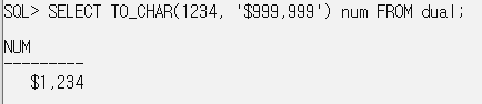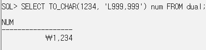 SELECT TO_CHAR(1234, 'L999,999') num FROM dual; // 원화를 지원하지 않을 경우 엔화나 위안이 출력.