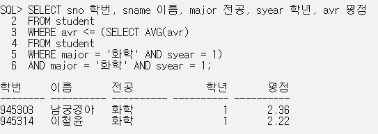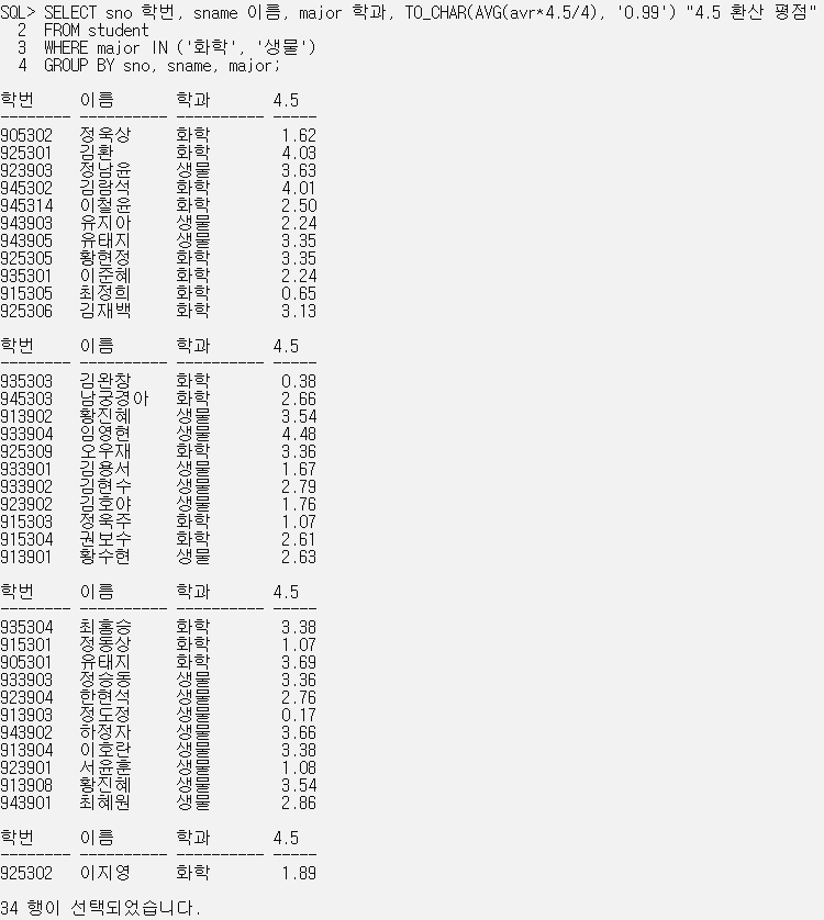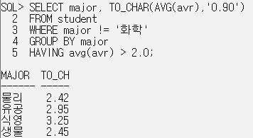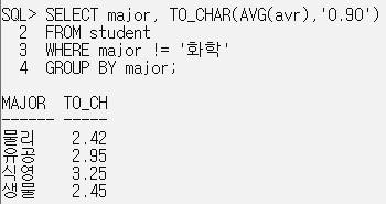 SELECT major 전공, TO_CHAR(AVG(avr),'0.90') 평균평점