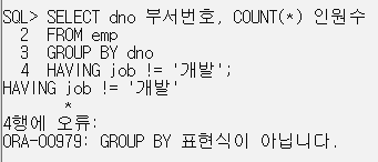 HAVING job != '개발'; // 그룹 함수가 들어가지 않기 때문에 오류. WHERE절에 써야함.
