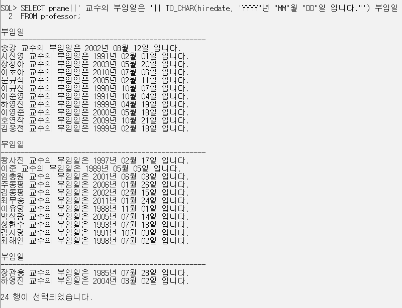 SELECT pname||' 교수의 부임일은 '|| TO_CHAR(hiredate, 'YYYY"년 "MM"월 "DD"일 입니다."') 부임일