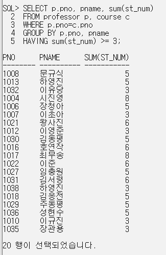 4. 강의 학점수가 3학점 이상인 교수의 정보를 검색한다.(교수번호, 이름과 담당 학점수)