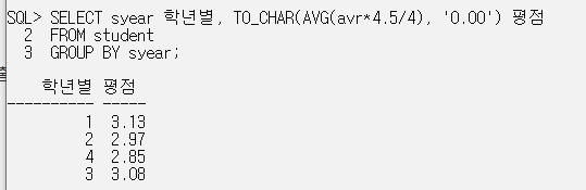SELECT syear 학년별, TO_CHAR(AVG(avr*4.5/4), '0.00') 평점