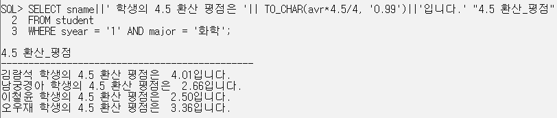 SELECT sname||' 학생의 4.5 환산 평점은 '|| TO_CHAR(avr*4.5/4, '0.99')||'입니다.' "4.5 환산_평점"
