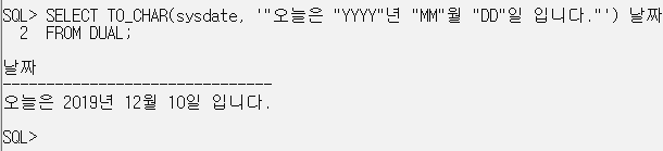 SELECT TO_CHAR(sysdate, '"오늘은 "YYYY"년 "MM"월 "DD"일 입니다."') 날짜
