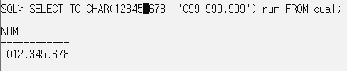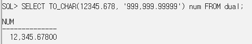 SELECT TO_CHAR(12345.678, '999,999.99999') num FROM dual; // 소수점 이하는 지정한 자리에 0을 채우고 앞은 무시