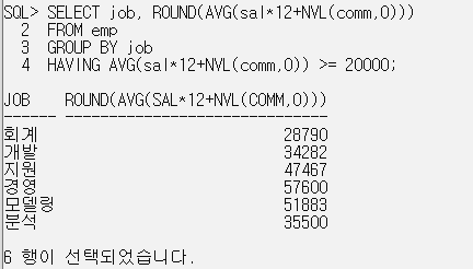 HAVING AVG(sal*12+NVL(comm,0)) >= 20000;