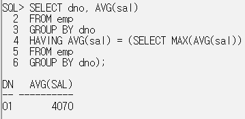 HAVING AVG(sal) = (SELECT MAX(AVG(sal))
