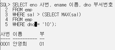 [예제 3] 10번 부서원들보다 급여가 높은 사원을 검색.