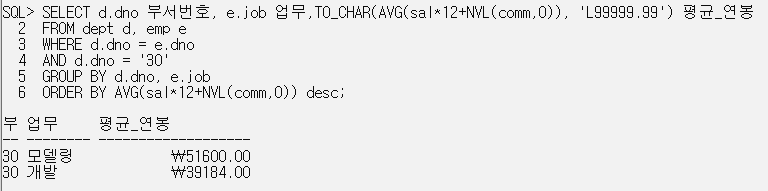 SELECT d.dno 부서번호, e.job 업무,TO_CHAR(AVG(sal*12+NVL(comm,0)), 'L99999.99') 평균_연봉