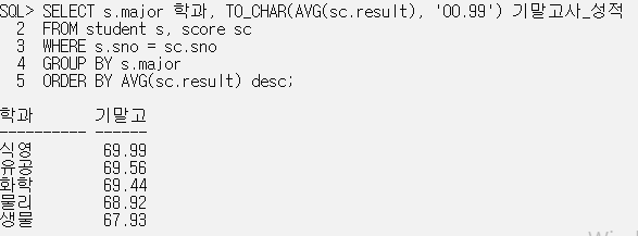 SELECT s.major 학과, TO_CHAR(AVG(sc.result), '00.99') 기말고사_성적
