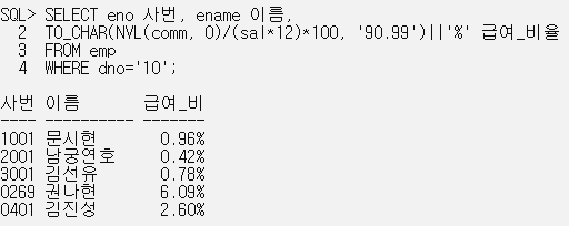 TO_CHAR(NVL(comm, 0)/(sal*12)*100, '90.99')||'%' 급여_비율 // 90.99에 0을 지정해야 0.96이 .96으로 나오는 것을 방지