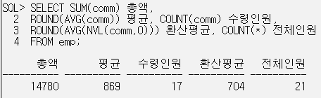 ROUND(AVG(comm)) 평균, COUNT(comm) 수령인원, // 보너스를 받는 사람으로만 평균 계산