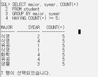8. 각 학과의 학년별 인원중 인원이 5명 이상인 학년을 검색한다.