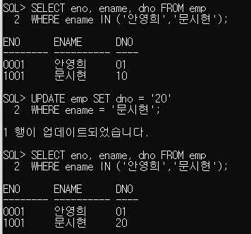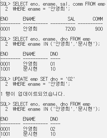 WHERE ename = '문시현'; // 수정된 값으로 조회 됨.