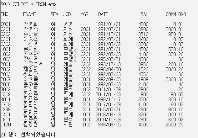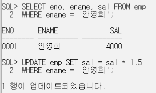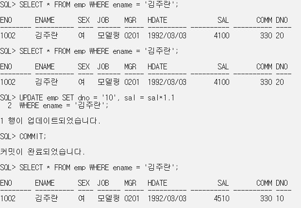 SELECT * FROM emp WHERE ename = '김주란'; // 갱신 정보 확인