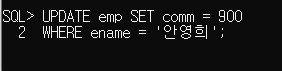 WHERE ename = '안영희'; // 세션2에서 COMMIT됐기 때문에 comm의 명령도 900으로 출력