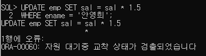 WHERE ename = '안영희'; // 둘다 웨이팅에 빠져서 무한 교착상태이기때문에 명령을 취소시킨다.