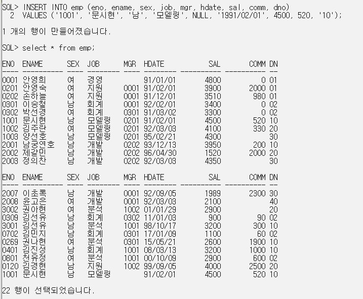 VALUES ('1001', '문시현', '남', '모델링', NULL, '1991/02/01', 4500, 520, '10');