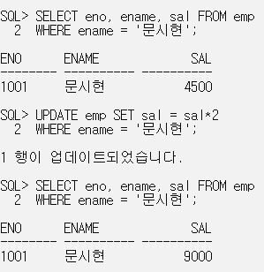 WHERE ename = '문시현'; // 급여를 2배로 수정