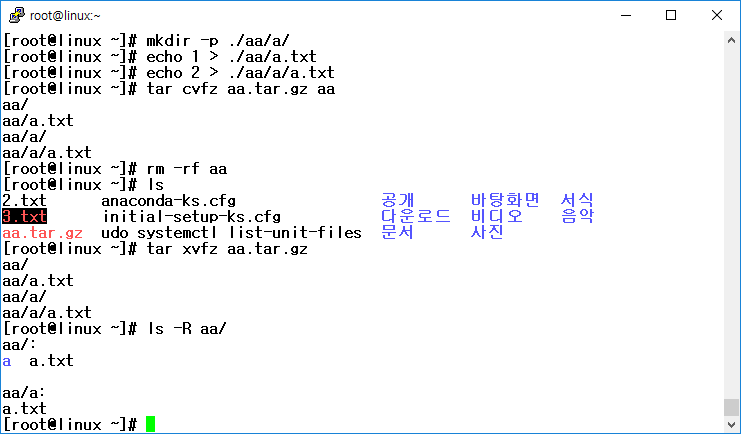 tar xvfz aa.tar.gz : aa.tar.gz 파일을 압축 해제(작업 내용을 출력하고 gzip을 이용)