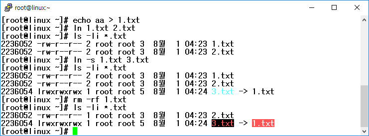 ln -s 1.txt 3.txt : 1.txt라는 원본 파일을 3.txt라는 심볼릭 링크 파일로 생성