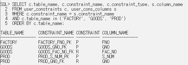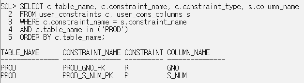 WHERE c.constraint_name = s.constraint_name // 이름이 같은 부분에 대해서만 검색