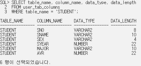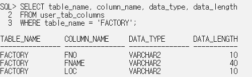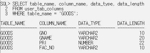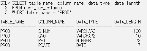 WHERE table_name = '테이블 이름'; // desc와 같고 테이블 이름은 대문자로 검색