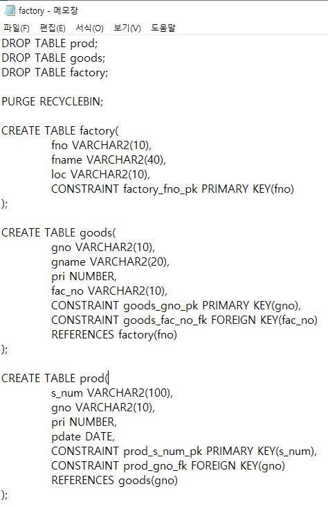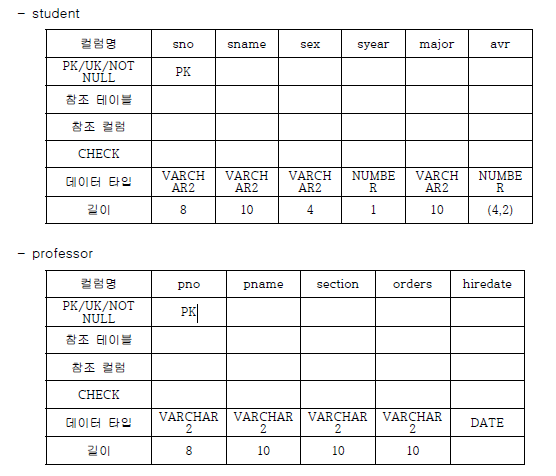 [예제 3]다음과 같은 구조의 테이블을 생성하는 스크립트를 작성하고 이를 이용 테이블을 생성.