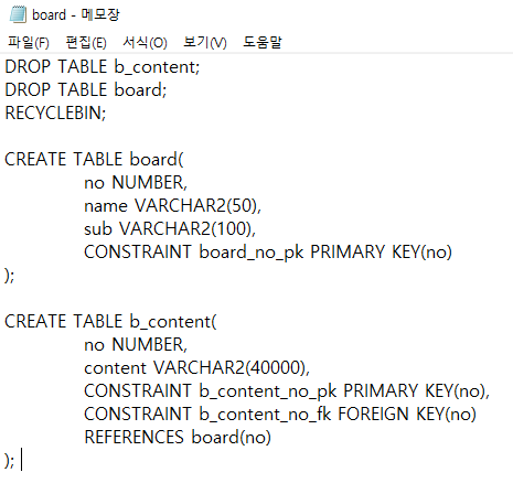 CONSTRAINT 제약_조건 PRIMARY KEY (컬럼) // CONSTRAINT는 예약어. 이 다음에 제약 조건이 온다.
