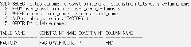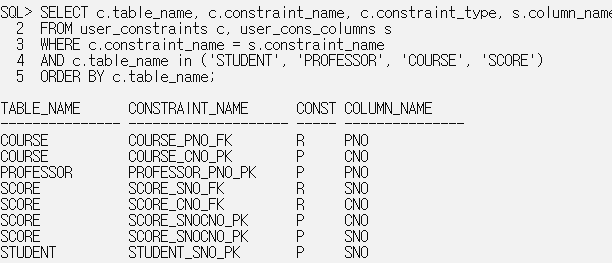 WHERE c.constraint_name = s.constraint_name // 이름이 같은 부분에 대해서만 검색