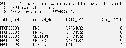 WHERE table_name = '테이블 이름'; // desc와 같고 테이블 이름은 대문자로 검색