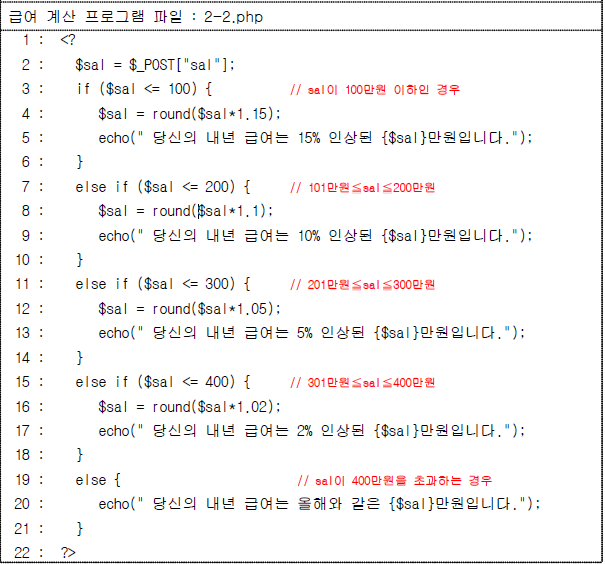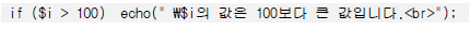 echo문은 $i의 값이 100보다 클 경우에만 출력. if문에서 조건에따라 실행도리 문장이 하나일 경우에는 위와 같이 { }(중괄호)를 생략할수 있으나 항상 써주는 습관을 가지도록 한다.