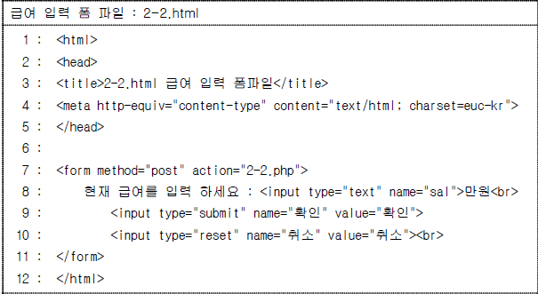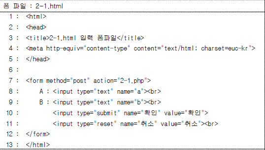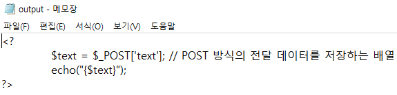 예제를 해보기전에 post방식의 입출력 form파일을 input.html과 output.php 파일로 만들어 준다.