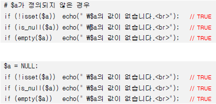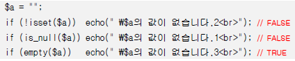 PHP가 빈 값과 NULL값을 다르게 본다는 것을 의미하며, 이로인한 오류가 많이 나기때문에 empty만 사용한다.