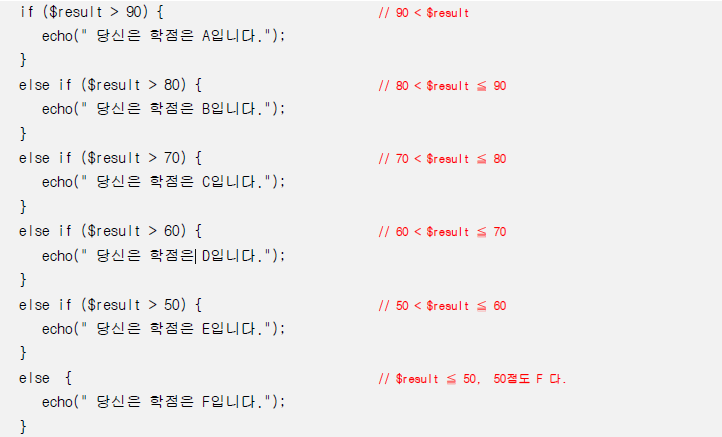 $result를 학점으로 환산하는 프로그램. else if를 이용한 중첩조건은 위에서 부터 차례대로 조건을 확인하기 때문에 조건을 기술하는 순서가 반드시 논리적으로 맞아야 한다.