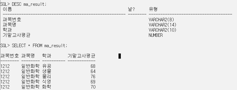 SELECT * FROM ma_result; // view도 일반 table처럼 사용 가능. 데이터를 갖고있는게 아니라 가지고 온다.