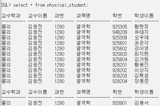 CREATE OR REPLACE VIEW physical_student (교수학과, 교수이름, 과번, 과목명, 학번, 학생이름)