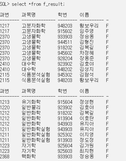 CREATE OR REPLACE VIEW f_result (과번, 과목명, 학번, 이름, 평가점수)