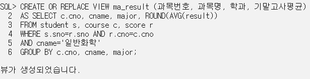 CREATE OR REPLACE VIEW ma_result (과목번호, 과목명, 학과, 기말고사평균)