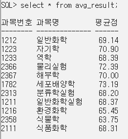 CREATE OR REPLACE VIEW avg_result (과목번호, 과목명, 평균점수)