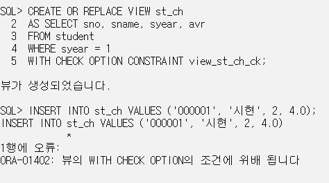 INSERT INTO st_ch VALUES ('000001', '시현', 2, 4.0); // 뷰를 통해 검색되지 않는 데이터는 입력 불가