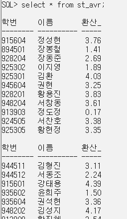 CREATE OR REPLACE VIEW st_avr (학번, 이름, 환산_학점)