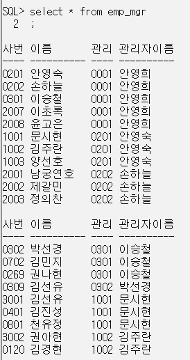 CREATE OR REPLACE VIEW emp_mgr (사번, 이름, 관리자번호, 관리자이름)