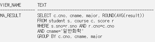 GROUP BY c.cno, cname, major; // 위와 같은 검색을 VIEW를 이용해 만든 구문