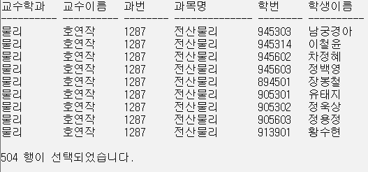 7. 물리학과 교수의 과목을 수강하는 학생의 명단을 검색할 뷰를 생성.